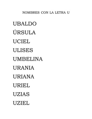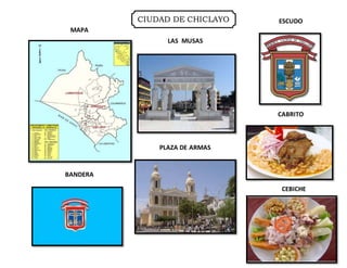 El documento lista varios elementos representativos de la ciudad de Chiclayo como su mapa, escudo, plaza de armas y bandera, así como platillos típicos como el cebiche y el cabrito. También enumera una serie de nombres que comienzan con la letra U.