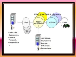 El documento describe la historia y el funcionamiento de los nombres de dominio y protocolos de Internet. Originalmente, cada ordenador en ARPANET tenía asignada una dirección numérica, pero se propuso un sistema de nombres de dominio para facilitar la identificación de los hosts. Actualmente, cada usuario tiene una dirección IP numérica y un nombre de dominio alfabético asociado para una mejor memorización. Las organizaciones como ICANN y los registros de dominios gestionan la asignación y registro de los nombres de dominio.