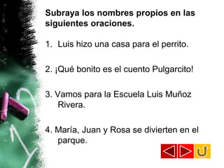 El documento presenta una lección sobre cómo identificar nombres propios. Se pide subrayar los nombres propios en varias oraciones de ejemplo y elegir nombres apropiados para ilustrar a un perro y una niña. También se pide identificar globos con nombres propios en un diagrama.