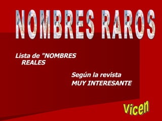 Este documento presenta una lista de nombres reales extraídos de una revista, muchos de los cuales tienen significados cómicos o dobles sentidos debido a su combinación con los apellidos. Algunos nombres incluyen Agustín Cabeza Compostizo, Antonio Bragueta Suelta, Román Calavera Calva y Alberto Comino Grande. Los comentarios reconocen la posible dureza de las infancias sugeridas por estos nombres así como la imaginación o estado mental de los padres al elegirlos.