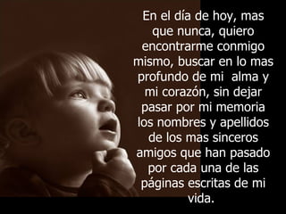 El documento reflexiona sobre la importancia de los amigos a lo largo de la vida de una persona. Agradece a los amigos que han estado presentes en los momentos difíciles y que comparten sonrisas. Reconoce que la amistad va más allá de los momentos agradables y implica apoyo incondicional sin importar barreras. Finalmente, da las gracias a cada amigo por haber formado parte de su historia y vida.