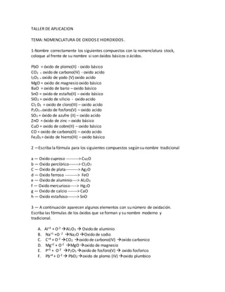 El documento presenta un taller sobre la nomenclatura de óxidos e hidróxidos. Incluye ejercicios para nombrar compuestos según su fórmula química y viceversa, así como para construir fórmulas a partir de reacciones químicas de formación de óxidos e hidróxidos. También contiene ejercicios sobre ácidos y sales, incluyendo su clasificación, escritura de ecuaciones y nombres tradicionales.