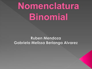 El documento describe el sistema de nomenclatura científica para nombrar especies biológicas, el cual consiste en un nombre binominal formado por el género y la especie en latín. Explica que la especie pertenece a una categoría de individuos morfológicamente similares que pueden reproducirse entre sí de forma fértil. Además, define el género como un nivel taxonómico compuesto por una o más especies evolutivamente cercanas.