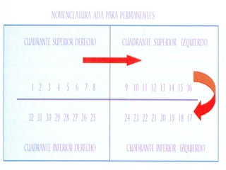 El documento describe la nomenclatura utilizada para identificar órganos dentales, considerando factores como la posición (superior/inferior, derecho/izquierdo) y su clasificación en cuadrantes. Se presentan tres sistemas de clasificación para dientes temporales y permanentes: la clasificación de Palmer, la clasificación continua y la clasificación internacional (sistema F.D.I.). Cada sistema utiliza diferentes símbolos y números para facilitar la identificación de los dientes en función de su localización en la boca.