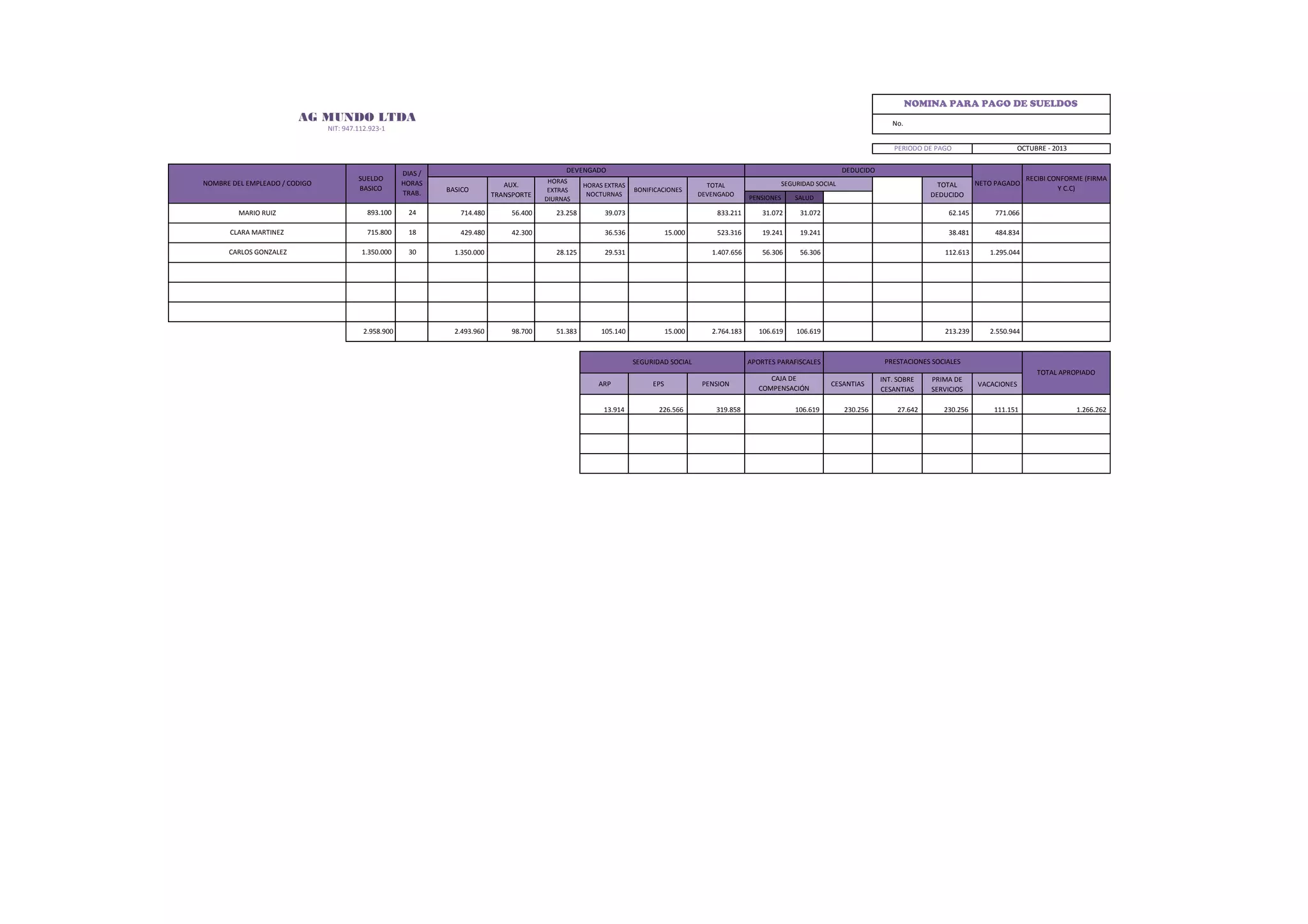 Este documento es una nomina de pagos de sueldos para la empresa AG Mundo Ltda correspondiente al mes de octubre de 2013. En ella se detallan los nombres, sueldos basicos, horas trabajadas, devengados y deducciones de tres empleados - Mario Ruiz, Clara Martinez y Carlos Gonzalez. Adicionalmente presenta los totales apropiados para prestaciones sociales como cesantias, vacaciones e intereses sobre cesantias.