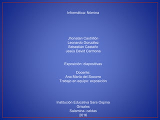 Este documento habla sobre la nómina, que es el registro financiero de los sueldos de los empleados de una empresa. Incluye conceptos como salarios, horas trabajadas, bonificaciones, deducciones de seguridad social e impuestos, y el monto líquido que recibe cada empleado. Explica los pasos para calcular los ingresos brutos, las deducciones legales y el saldo a cobrar. También menciona requisitos de la nómina en Argentina y España.