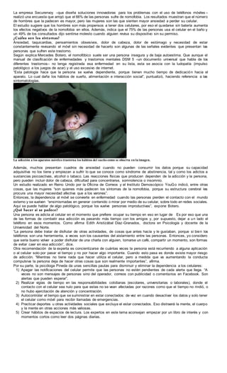 Este documento habla sobre la nomofobia, un trastorno psicológico causado por la dependencia excesiva a los teléfonos celulares. La nomofobia genera ansiedad y pánico cuando las personas no tienen acceso inmediato a su celular. Afecta principalmente a los jóvenes y se manifiesta a través de síntomas como ansiedad, dolor de cabeza y necesidad constante de revisar el celular. Para combatir la nomofobia, los expertos recomiendan limitar el uso del celular y pasar más tiempo realizando otras