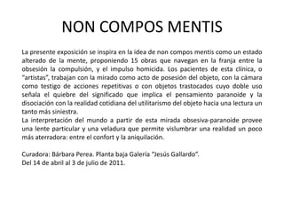 La exposición presenta 15 obras de arte que exploran estados mentales alterados como la obsesión, la compulsión y los impulsos homicidas desde una perspectiva lúdica. Los artistas usan la cámara y objetos trastocados para examinar la realidad desde una mirada paranoide y disociada. La muestra ofrece una visión más aterradora de la realidad que se ubica entre el confort y la aniquilación. La exposición se presenta en la Galería "Jesús Gallardo" del 14 de abril al 3 de jul