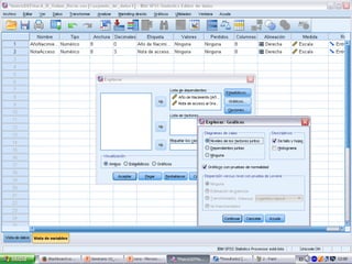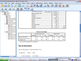 Este documento presenta el análisis de correlación entre dos variables cuantitativas, el año de nacimiento y la nota de acceso, de un cuestionario. Se realizan las pruebas de normalidad de ambas variables y se determina que no siguen una distribución normal, por lo que se utiliza el estadístico de Spearman. Los resultados muestran que no existe correlación entre las dos variables.