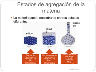 El documento describe los diferentes estados de agregación de la materia (sólido, líquido y gaseoso) y los cambios entre estos estados conocidos como cambios de estado. Explica los procesos de fusión, solidificación, condensación, licuación, vaporización, volatilización y sublimación, dando ejemplos de cada uno.
