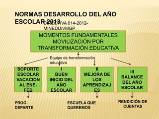 Este documento establece las normas y directivas para el desarrollo del año escolar 2013 en Perú. Detalla los momentos fundamentales como el inicio del año escolar, la mejora de los aprendizajes de los estudiantes, y el balance al final del año. También describe los hitos y evaluaciones clave que deben realizarse, así como la elaboración del Plan Anual de Trabajo entre noviembre y diciembre para guiar las actividades del próximo año.