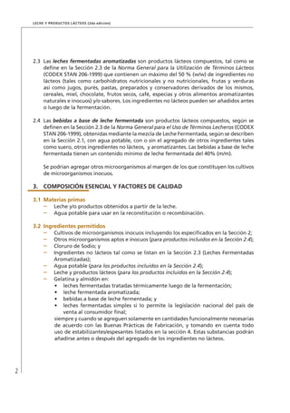 Este documento establece las normas para leches fermentadas según el Codex Alimentarius. Define leches fermentadas, yogur, kefir y otros productos. Establece requisitos de composición como proteína mínima, acidez y recuentos microbianos. También permite ciertos ingredientes y aditivos alimentarios y especifica los requisitos aplicables a productos compuestos y tratados térmicamente.