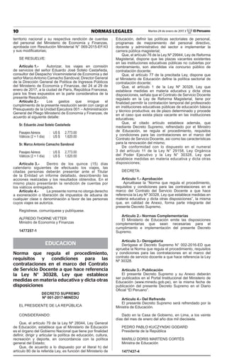 Este documento aprueba la norma que regula el procedimiento, requisitos y condiciones para las contrataciones docentes temporales en instituciones educativas públicas de acuerdo a la Ley No 30328. Autoriza también los viajes de dos funcionarios del Ministerio de Economía y Finanzas a Francia y establece los gastos correspondientes.