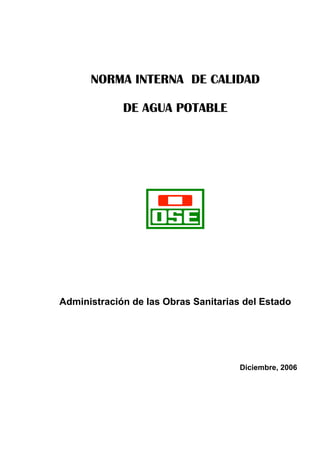 La norma interna establece los requisitos de calidad microbiológicos, químicos y físicos que debe cumplir el agua para consumo humano en Uruguay. Define parámetros como coliformes totales, arsénico, flúor y otros y establece valores máximos permitidos. El documento también describe métodos de muestreo y análisis para evaluar estos parámetros. El objetivo es proteger la salud de los consumidores asegurando que el agua sea apta para beber.