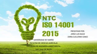 Este documento presenta un resumen de la norma ISO 14001 sobre sistemas de gestión ambiental. Explica brevemente los antecedentes y evolución de la norma desde la Declaración de Estocolmo de 1972 hasta la publicación de la norma ISO 14001 en 2015. Luego resume los principales requisitos de un sistema de gestión ambiental de acuerdo con la norma, incluyendo la política ambiental, planificación, implementación, verificación y revisión por la dirección. Concluye agradeciendo la atención del lector.