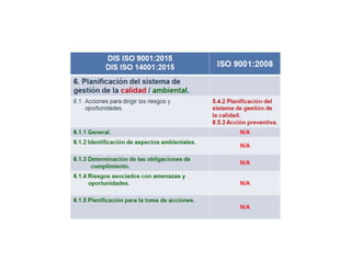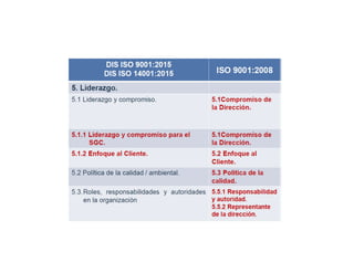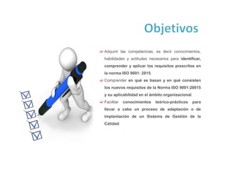 1) El documento presenta los objetivos de adquirir las competencias necesarias para aplicar los requisitos de la norma ISO 9001:2015 y comprender los nuevos requisitos y su aplicabilidad. 2) Se busca facilitar conocimientos teórico-prácticos para implantar o adaptar un sistema de gestión de calidad. 3) Se define el sistema de gestión de calidad y sus elementos como la planificación, aseguramiento y control de la calidad, así como la mejora continua.