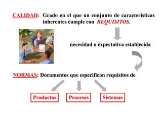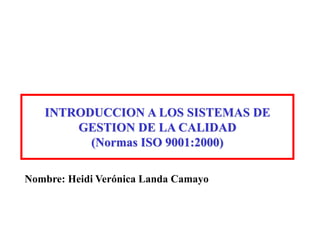 Este documento introduce los sistemas de gestión de la calidad según la norma ISO 9001:2000. Explica brevemente que la calidad se refiere al grado en que un producto cumple los requisitos, y que las normas especifican los requisitos para productos, procesos y sistemas. También resume las fases evolutivas de la calidad, los beneficios de implementar un sistema de gestión de la calidad certificado, y los pasos básicos para abordar la gestión de la calidad.
