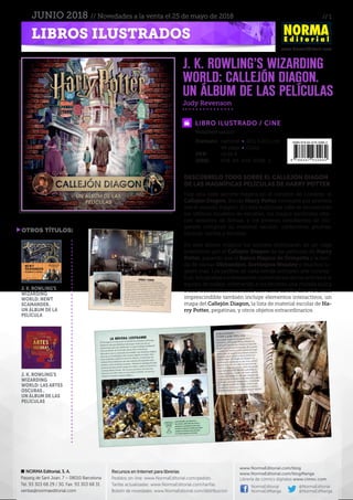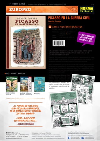 Este documento presenta las novedades editoriales de Norma Editorial para el mes de junio de 2018, incluyendo libros ilustrados, novelas gráficas y cómics sobre temas como Harry Potter, Picasso, la Guerra Civil Española y ciencia ficción. Proporciona detalles sobre cada título como formato, número de páginas, precio y resumen de la trama. También incluye información de contacto de la editorial y enlaces a su página web y redes sociales.