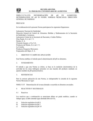 Este documento establece el método para determinar el pH en alimentos mediante la medición electrométrica de la actividad de los iones hidrógeno presentes en una muestra del producto utilizando un potenciómetro. Describe los procedimientos de preparación de la muestra, calibración del equipo, toma de lecturas y expresión de resultados.