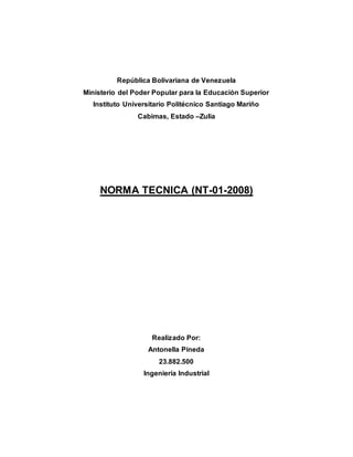 La Norma Técnica (NT-01-2008) establece procedimientos para el diseño, implementación, seguimiento y evaluación de programas de seguridad y salud en el trabajo con el fin de prevenir accidentes y enfermedades laborales. Se recomienda aplicar esta norma a todos los centros de trabajo en Venezuela, tanto públicos como privados, para que los programas de seguridad laboral sigan los lineamientos requeridos y protejan adecuadamente a los trabajadores.