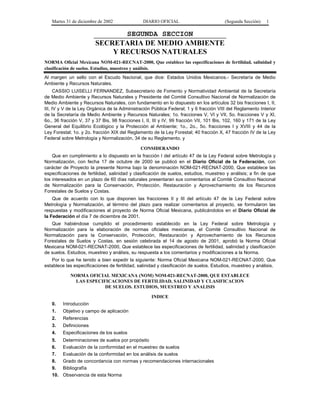 Este documento presenta la Norma Oficial Mexicana NOM-021-RECNAT-2000, que establece las especificaciones para los estudios de fertilidad, salinidad y clasificación de suelos. La norma tiene como objetivo regular los análisis de suelos para garantizar su correcta ejecución y proporcionar información confiable a los usuarios. Incluye definiciones técnicas y establece los procedimientos de muestreo y análisis que deben seguirse. La norma busca prevenir la degradación de los suelos y log
