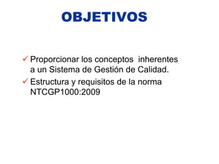 El documento presenta los objetivos y alcance de un taller sobre la norma técnica NTCGP1000:2009 para la gestión de calidad en la gestión pública. Explica los conceptos básicos de un sistema de gestión de calidad como la mejora continua, enfoque a procesos y ciclo PHVA. También resume los principales requisitos de la norma como la responsabilidad de la dirección, planificación, gestión de documentos y procesos, y medición y mejora.
