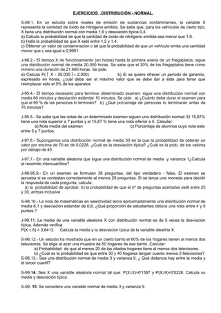 El documento contiene una serie de ejercicios sobre distribuciones normales. Los ejercicios piden calcular probabilidades para diferentes intervalos y parámetros de distribuciones normales, como la media, desviación típica y percentiles. También incluye ejercicios sobre muestras aleatorias de poblaciones normales.
