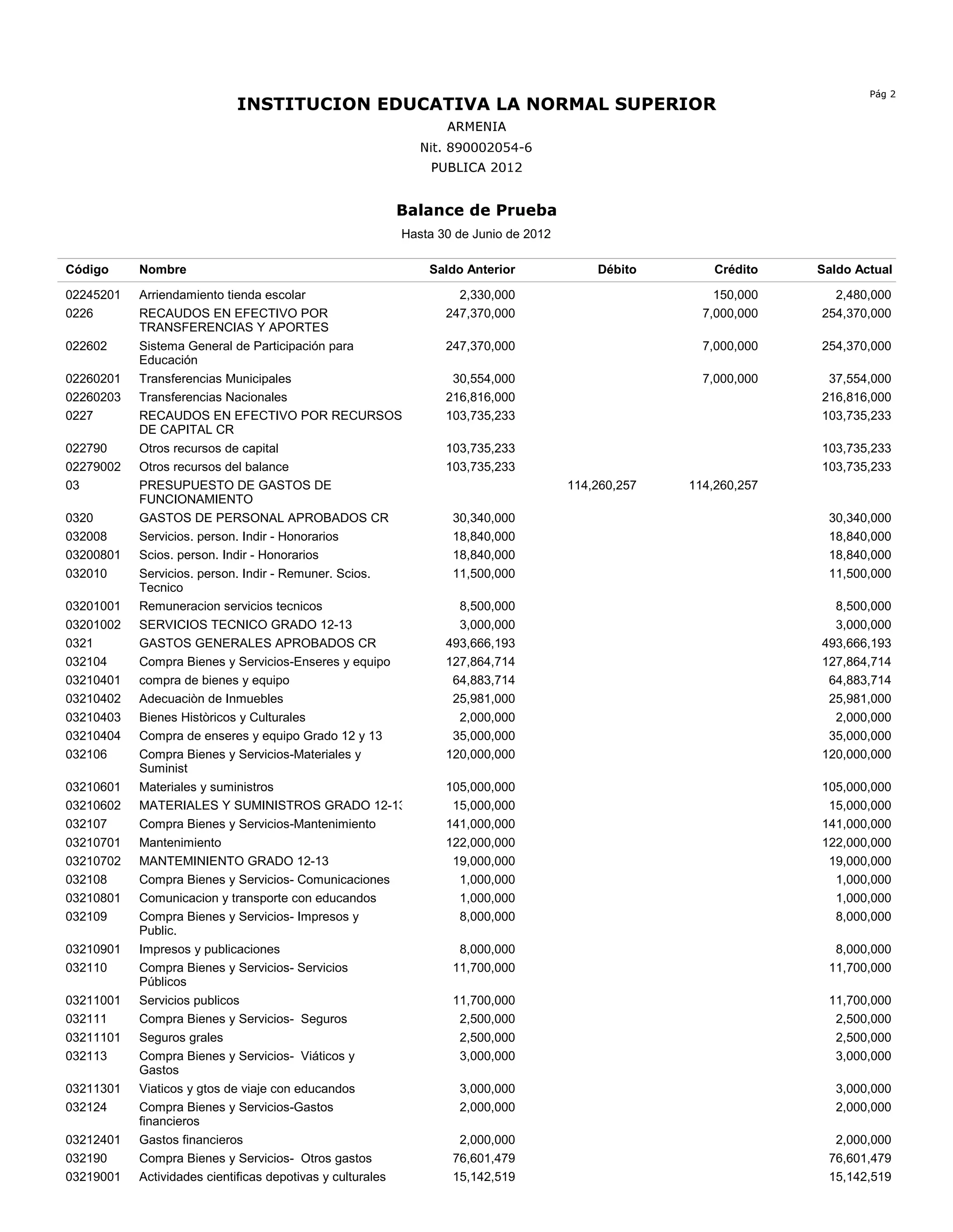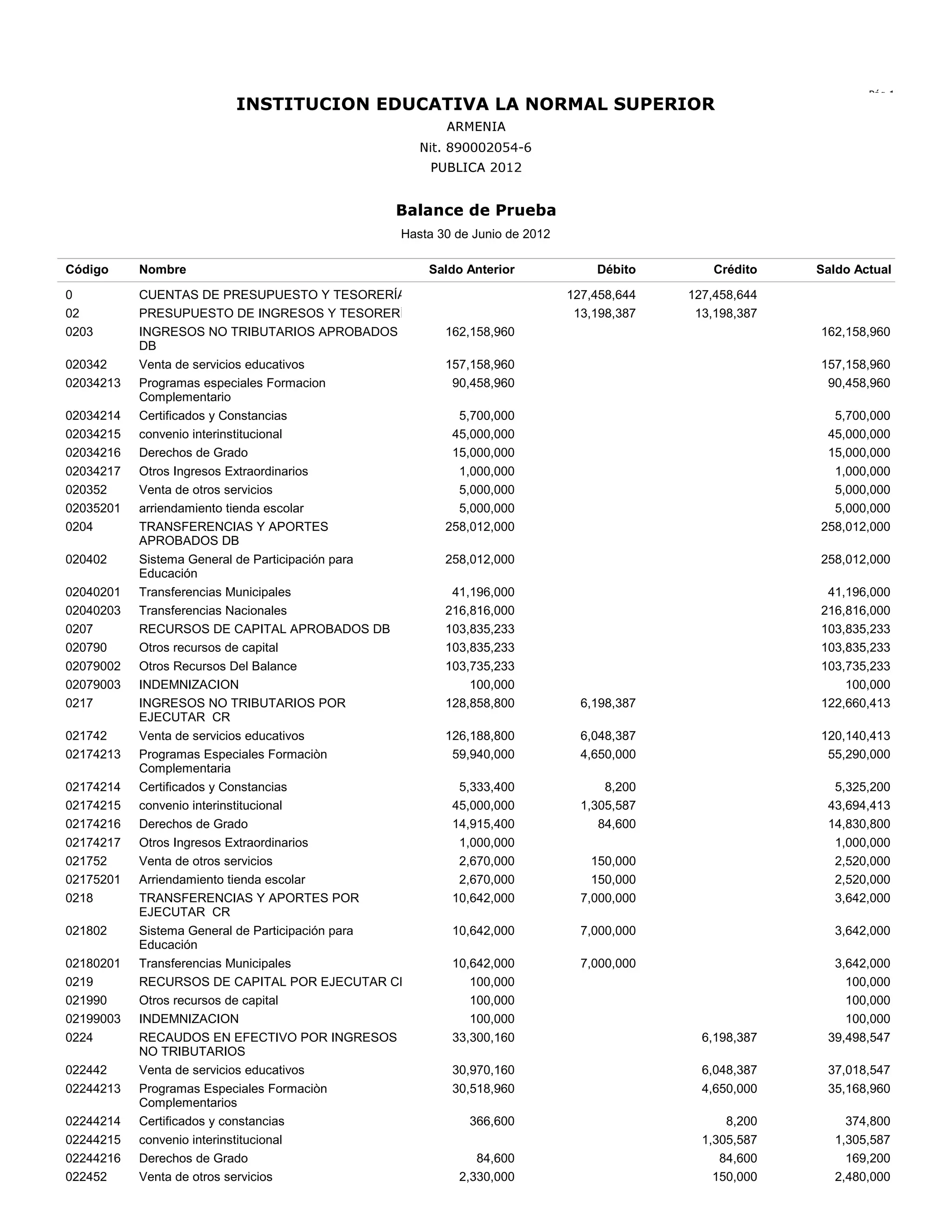 Este documento presenta el balance de prueba de la Institución Educativa La Normal Superior en Armenia hasta el 30 de junio de 2012. Incluye los saldos de cuentas de presupuesto, ingresos, transferencias, gastos de personal y gastos generales aprobados para el año fiscal.