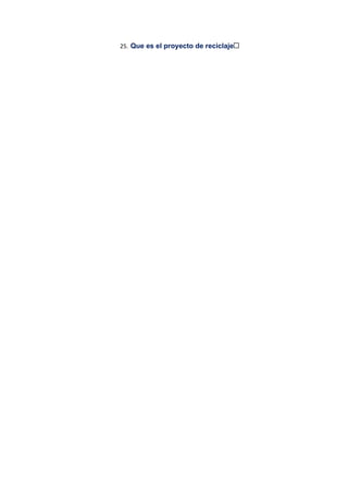Este cuestionario evalúa el proyecto de reciclaje de la Normal Superior mediante 25 preguntas sobre los materiales recolectados, cómo se lleva a cabo, sus beneficios para la vida diaria y la institución, las asignaturas y personas encargadas, y formas de mejorarlo para promover el reciclaje, proteger el medio ambiente y enseñar conceptos de sostenibilidad a la comunidad estudiantil.