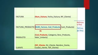 Factura(NUM_FAC, FECHA_FAC, NOM_CLIENTE, DIR_CLIENTE, RIF_CLIENTE,