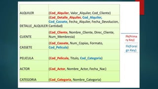 Alquiler (cod_alquiler, num_membresia, cod_cliente, nom_cliente, dir_cliente, telef_cliente, cod_cassette, fecha_alquiler,
