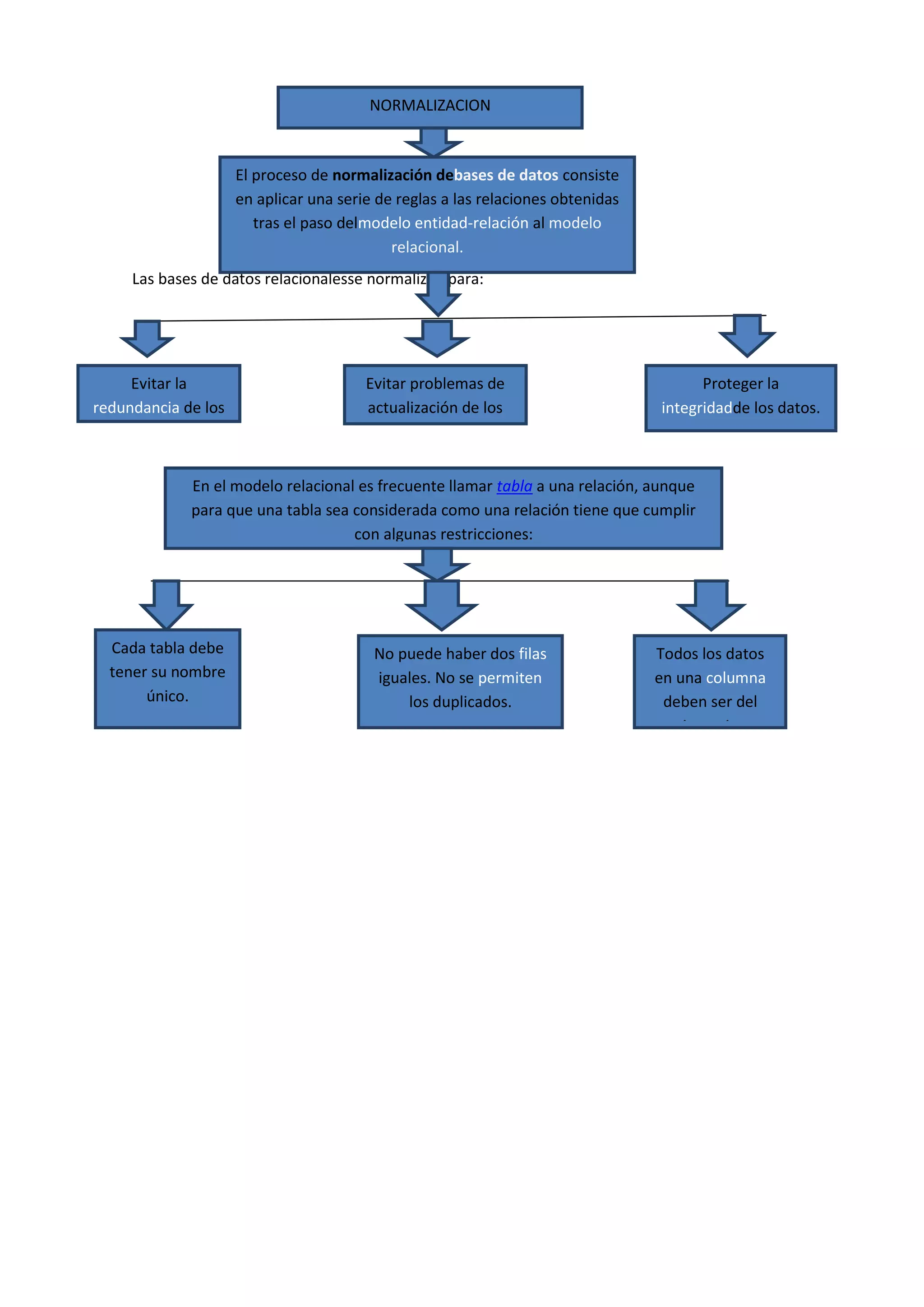 La normalización de bases de datos consiste en aplicar reglas a las relaciones del modelo entidad-relación para convertirlas al modelo relacional y evitar la redundancia y problemas de actualización de datos, protegiendo la integridad de los datos. En el modelo relacional, una tabla debe tener un nombre único, no puede haber filas duplicadas y los datos de una columna deben ser del mismo tipo para que sea considerada una relación.