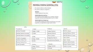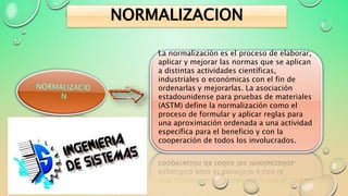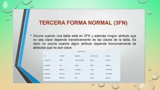 La normalización es un proceso para evitar problemas como redundancia, ambigüedades y anomalías en las operaciones de modificación de datos en las bases de datos relacionales. Incluye reglas para estructurar las tablas y eliminar dependencias funcionales para que cada actualización afecte a un solo dato. El documento explica las formas normales hasta la quinta forma normal y provee enlaces para más información sobre normalización.