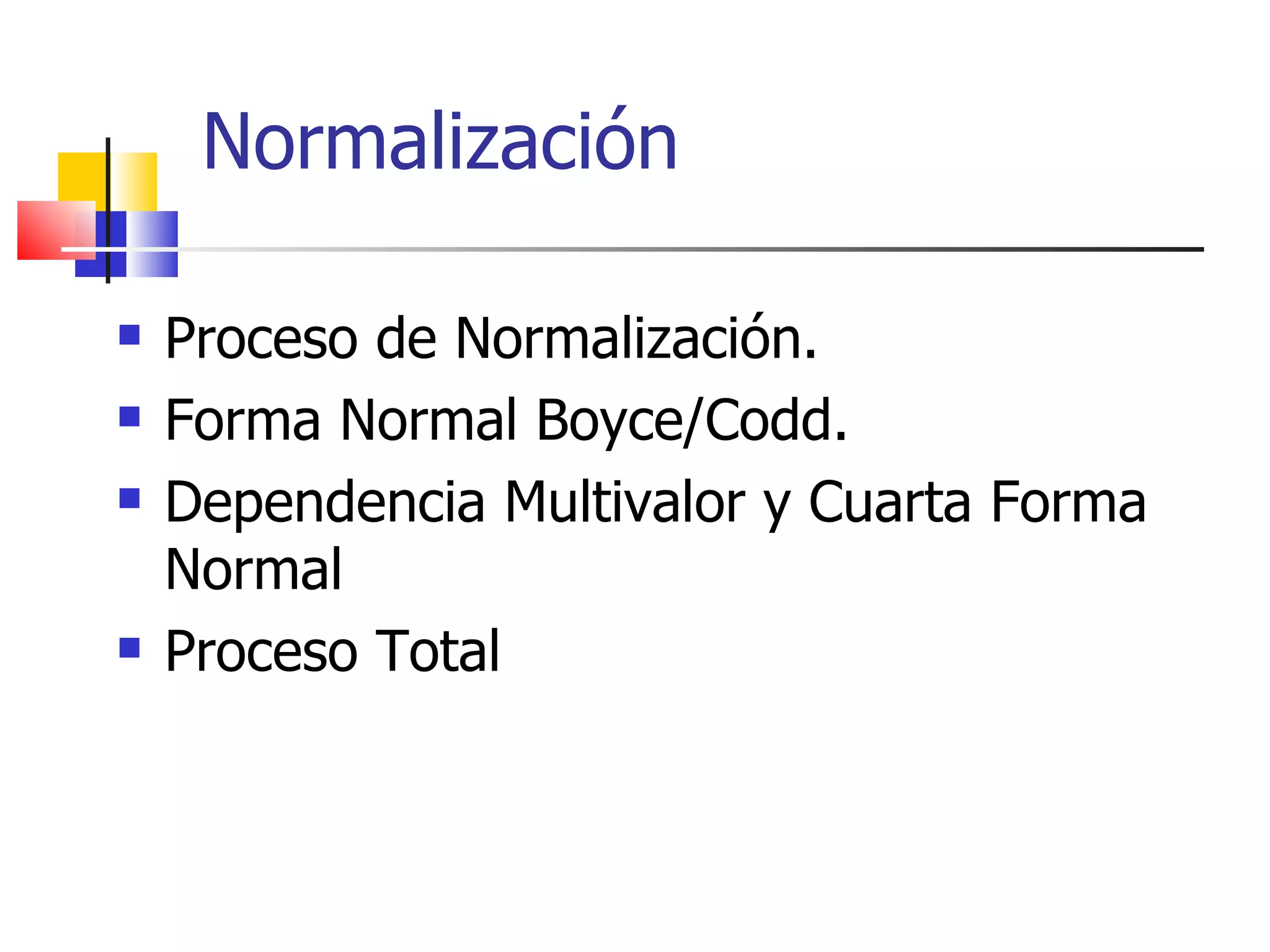 1) El documento describe los conceptos de normalización de bases de datos, incluyendo las primeras, segunda y tercera formas normales. 2) También explica la forma normal de Boyce-Codd y la cuarta forma normal, así como cómo tratar las dependencias multivalores. 3) La normalización elimina la redundancia de datos y anomalías al dividir tablas grandes en tablas más pequeñas con relaciones entre ellas.