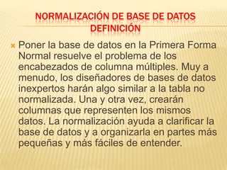 La normalización de bases de datos implica tres formas normales. La primera forma normal elimina las columnas repetidas colocándolas en tablas separadas. La segunda forma normal separa los datos que no dependen completamente de la llave primaria en sus propias tablas para eliminar dependencias parciales. La tercera forma normal elimina las dependencias transitivas al separar columnas que dependen de otras columnas no clave.