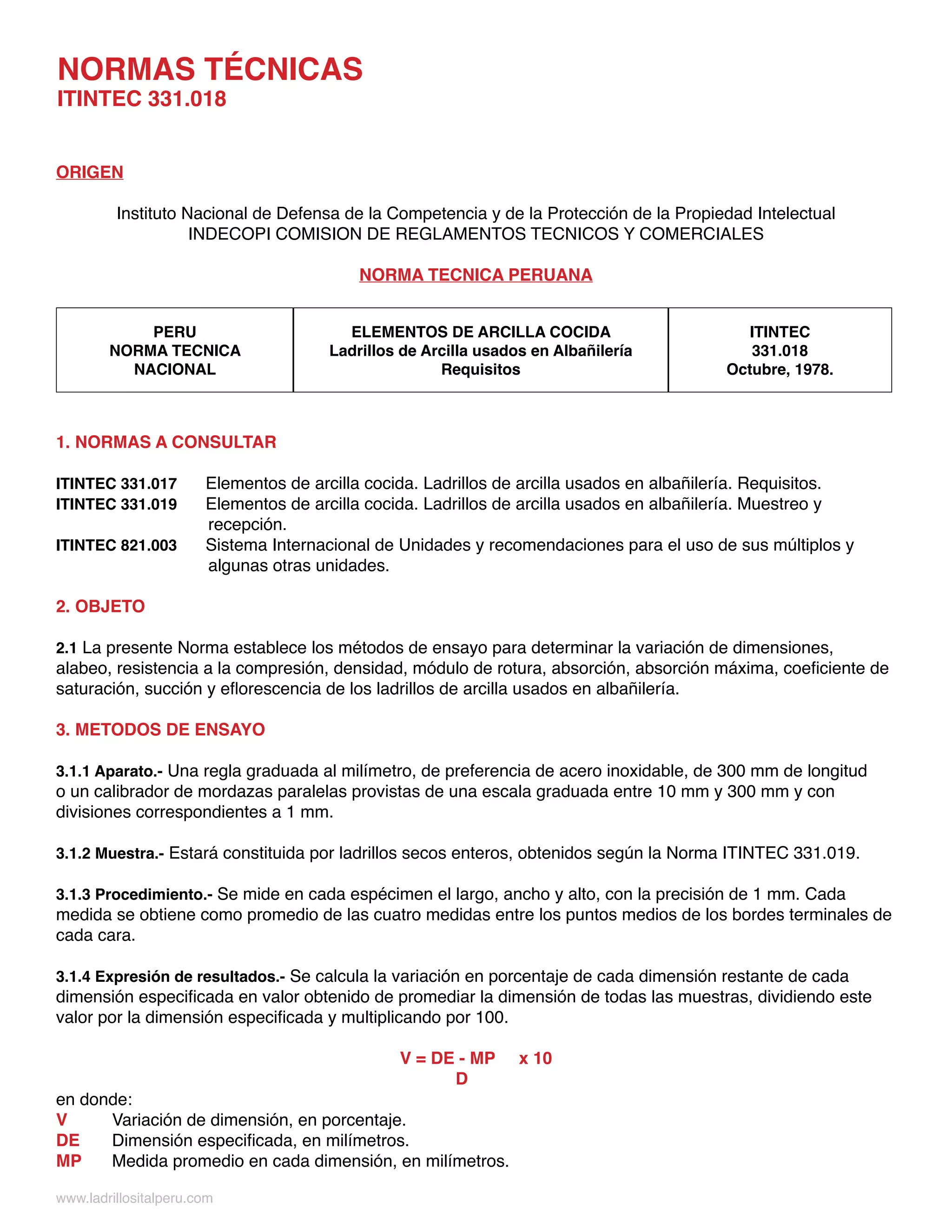 Este documento establece los métodos de ensayo para determinar las propiedades físicas y mecánicas de ladrillos de arcilla, incluyendo la variación de dimensiones, alabeo, resistencia a la compresión, densidad, módulo de rotura, absorción, entre otros. Describe los aparatos, muestras y procedimientos requeridos para cada prueba, así como la forma de expresar y reportar los resultados obtenidos.