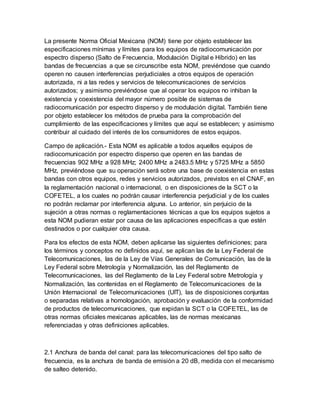 Este documento establece las especificaciones mínimas y límites para equipos de radiocomunicación por espectro disperso en bandas de frecuencias entre 902-928 MHz, 2400-2483.5 MHz y 5725-5850 MHz. También define métodos de prueba para verificar el cumplimiento de las especificaciones y contribuir a la protección de los consumidores de estos equipos.