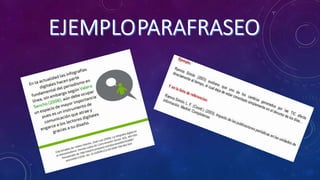 El documento explica los dos tipos principales de citas - citas directas y citas indirectas - y describe cuatro formas de realizar citas directas dependiendo del contenido y énfasis. También cubre cómo incluir citas de menos de 40 palabras dentro del texto y citas de más de 40 palabras como un párrafo separado, y explica la diferencia entre una lista de referencias y una bibliografía.