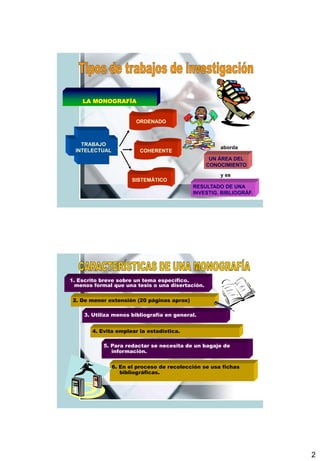 Este documento proporciona información sobre la monografía como un tipo de trabajo académico. Explica que una monografía es un escrito breve sobre un tema específico que utiliza menos bibliografía y evita la estadística en comparación con una tesis. Además, detalla las etapas para redactar una monografía como elegir un tema, explorar fuentes de información, ordenar materiales y redactar la monografía. Finalmente, incluye instrucciones sobre cómo citar diferentes tipos de fuentes bibliográficas en