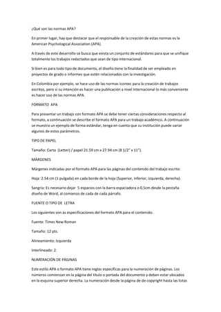 Las normas APA son estándares creados por la American Psychological Association para uniformar los trabajos académicos internacionales. Establecen pautas para el formato, citas, referencias bibliográficas, tablas, figuras y otros elementos. Aunque se usan principalmente en investigaciones, también aplican para proyectos de grado.
