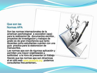 Las normas APA son directrices de la American Psychological Association para la creación de documentos académicos y proyectos de investigación, fundamentales para docentes y estudiantes. Estas normas aseguran una presentación organizada y estéticamente agradable de los trabajos, incluyendo pautas sobre tipografía, márgenes y citas. Además, se proporcionan ejemplos de referencias comunes para facilitar la elaboración de bibliografías.