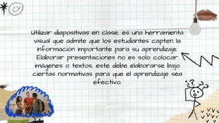 Este documento proporciona directrices sobre el formato APA para diapositivas. Explica que las diapositivas deben utilizarse como una herramienta visual para captar la atención de los estudiantes y transmitir la información clave de una manera ordenada. Recomienda incluir solo una idea por diapositiva usando oraciones completas, mayúsculas y puntuación correcta, así como colores de texto y fondo que contrasten. Además, instruye sobre cómo citar y proporcionar referencias bibliográficas completas al final de la present