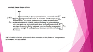 Este documento presenta las consideraciones más relevantes de la sexta edición de las normas APA para la presentación de textos académicos. Explica las normas generales sobre formato, citas, referencias bibliográficas y otros aspectos formales. Además, detalla los diferentes tipos de citas, cómo citar según el número de autores y cómo realizar referencias de libros, artículos y fuentes electrónicas.