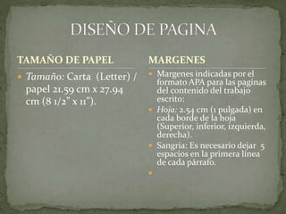 El documento proporciona información sobre el formato APA para la presentación de documentos escritos. Describe el tamaño de papel estándar, los márgenes requeridos, el estilo de fuente a utilizar y otras especificaciones de formato como la numeración de páginas y el uso de abreviaturas. También cubre temas como la creación de tablas de contenido y cómo incluir encabezados y números de página.