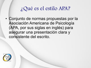 El documento introduce el estilo APA para citas y referencias bibliográficas. Explica que el APA es un conjunto de normas para presentar escritos de manera clara y consistente. Detalla las formas de realizar citas directas e indirectas en el texto y especifica cómo organizar la lista de referencias al final del documento.