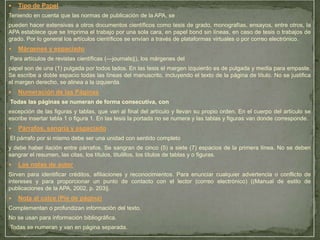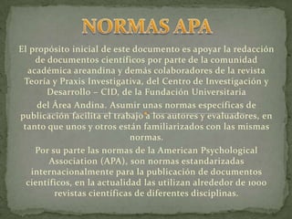 Este documento presenta las normas de publicación de la American Psychological Association (APA) para documentos científicos. Establece que los documentos deben imprimirse por una cara en papel bond sin líneas, con márgenes de una pulgada y espaciado doble. También especifica que las páginas deben numerarse de forma consecutiva y que los párrafos deben sangrarse cinco a siete espacios. El propósito es facilitar la publicación de documentos científicos en la revista areandina siguiendo estándares internacionales