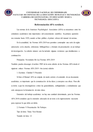 Este documento resume las principales novedades de las normas APA 2019 para la escritura y referenciación de documentos académicos. Explica los formatos requeridos para la presentación de textos, encabezados, seriación, tablas y figuras. Además, detalla los diferentes tipos de citas (textuales, paráfrasis, múltiples autores) y cómo incluirlas en el texto según el estilo APA. Finalmente, menciona algunas consideraciones sobre fuentes secundarias, comunicaciones personales y obras anónimas.