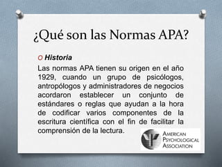 Las normas APA se originaron en 1929 cuando un grupo de académicos acordó establecer un conjunto de estándares para facilitar la comunicación científica. Estas normas proveen directrices para aspectos como formato, citas y referencias bibliográficas. Su uso se ha extendido a nivel mundial y son preferidas por muchas instituciones. Proporcionan un formato uniforme para mejorar la comprensión y precisión en la escritura académica.