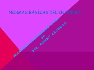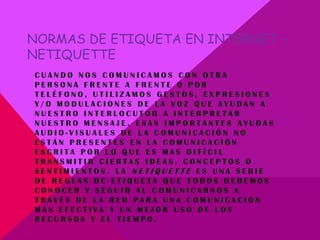 Este documento presenta las normas básicas de la netiqueta para una comunicación efectiva en Internet. Explica que en Internet no hay señales no verbales como en comunicaciones en persona o por teléfono, por lo que siguiendo normas como tratar a los demás con respeto, mantener los mensajes breves y al grano, y revisar los mensajes antes de enviarlos ayuda a mejorar la comunicación entre usuarios.