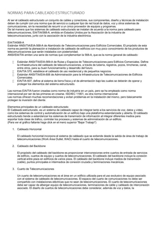 El documento describe las normas para el cableado estructurado, incluyendo la norma EIA/TIA/568-A establecida en EE.UU. Esta norma, junto con otras normas complementarias de EIA/TIA y ISO/IEC 11801, establecen los requisitos para los principales componentes de un sistema de cableado estructurado como el cableado horizontal, backbone, cuartos de telecomunicaciones y equipo, entrada de servicios y sistema de puesta a tierra.
